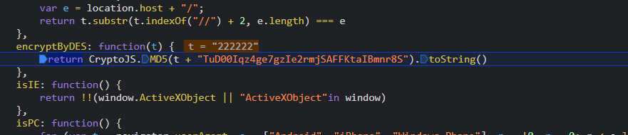某金所登录加密逻辑 2021年4月22日 Posted in js * 所有相关信息仅技术学习调研,不公开任何侵犯公司价值信息,若有侵犯,请联系删除 学习分析登录过程中密码有加密 通过定位加密位置 跟入函数encryptByDES 考虑到des加密 进入以后发现只是进行了哈希 直接复写哈希算法可得到值 * 所有相关信息仅技术学习调研,不公开任何侵犯公司价值信息,若有侵犯,请联系删除